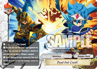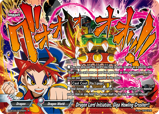 Dragon World just can't push damage fast enough, on average the best it can do is 4 attack, given that you have a item, size 0, size 1 and another size 1 or size 2. The best impact they have which is Gigahowling cost 3 gauge, requires item and your buddy or drum on the field, which can be very hard as there's no searcher for items, on top of that, if you want to call a size 2 armordragons with decent effect, it will cost you gauge, same goes to items, and there's no great and easy gauge acceleration spells, and most of the time the stats of dragon is so tiny its almost laughable, so doing OTK (one turn kill) like what Gao do in anime is almost impossible.